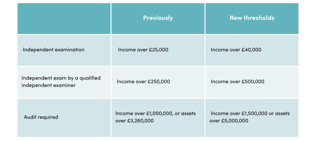 Audit and Independent Examination thresholds have also been reviewed this year, by the Department for Culture, Media and Sport, and are increasing. These changes are anticipated to come into effect from 1 October 2026.