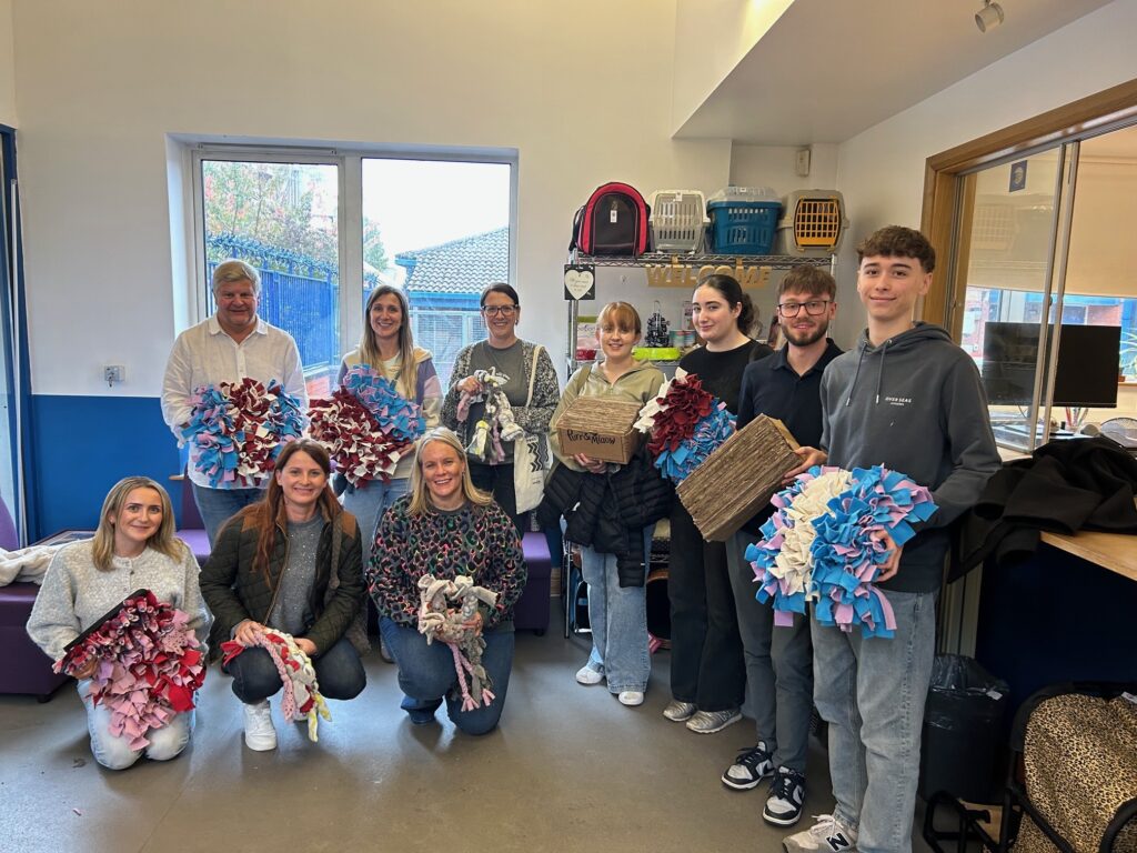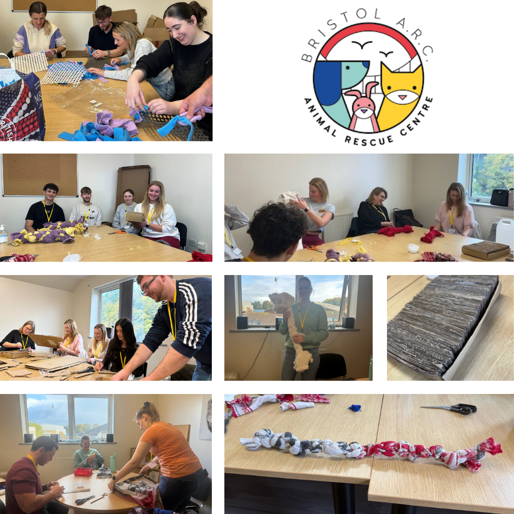 Across the two days, two enthusiastic groups of team members rolled up their sleeves and got creative. Together, they crafted four sturdy cat scratchers and a vibrant collection of dog tug toys in all shapes and sizes. These handmade creations will bring joy, enrichment, and comfort to the animals at Bristol ARC while they wait for their forever homes.
